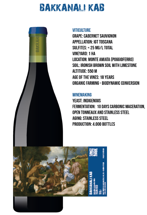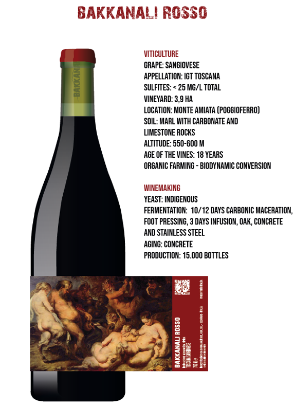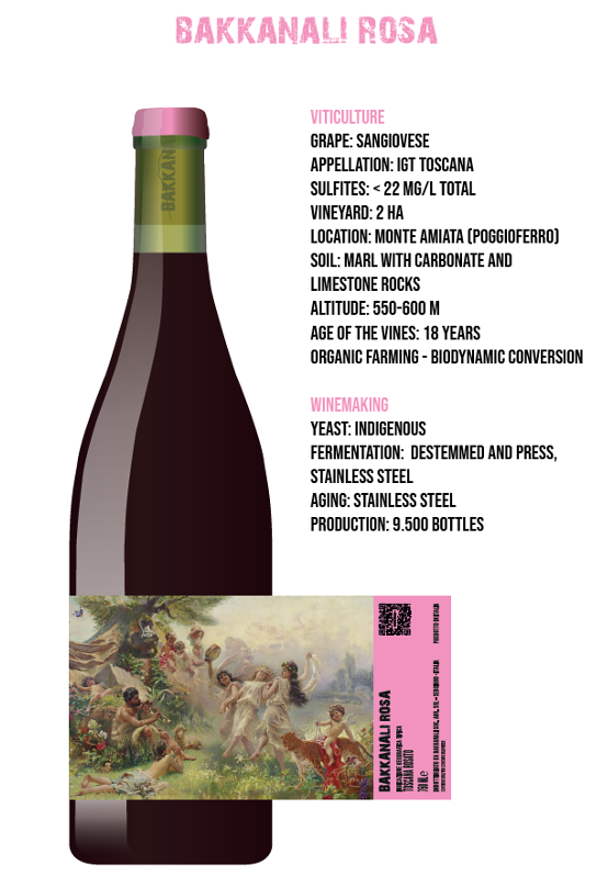 BAKKANALI is a young biodynamic winery located 600M above sea level on the northwest slope of the Monte Amiata. We grow 8.5 hectares of vines, mainly Sangiovese, and 300 Olive trees. We believe that the old volcano is the perfect place to product elegant and fine wines. The terroir is vocated to fight the changing climate and is the perfect partner for organic cultivation. Our wines are free of any chemical ingredient, all you can find in our bottles is a pure grape juice, with a deep identity of this magnificent volcanic soil